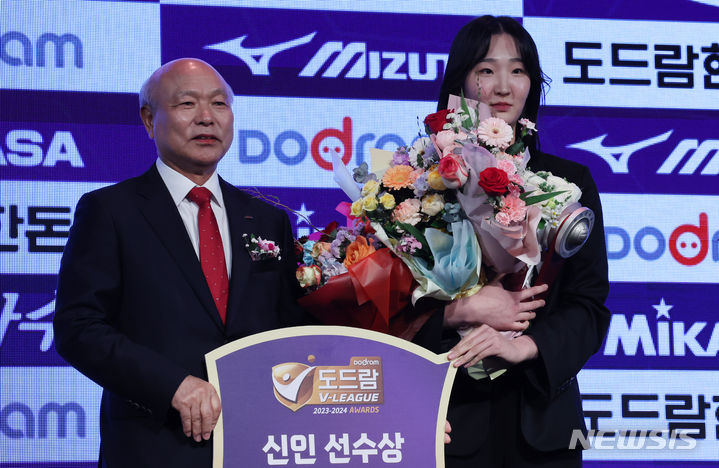 [서울=뉴시스] 조성우 기자 = 8일 오후 서울 서초구 더케이호텔에서 열린 2023~2024 V-리그 시상식에서 한국도로공사 김세빈이 여자부 신인선수상을 수상한 뒤 기념촬영을 하고 있다. 2024.04.08. [email protected]