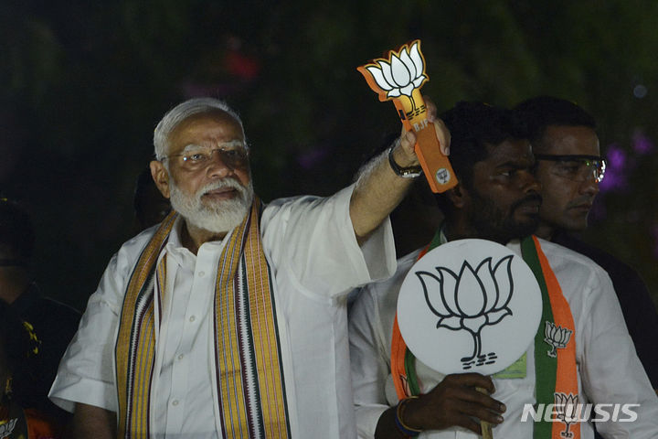 [첸나이=AP/뉴시스] 나렌드라 모디 인도 총리가 9일(현지시각) 인도 첸나이에서 열린 선거 운동 중 본인이 이끄는 '인도국민당'(BJP)을 상징하는 연꽃 조형물을 들고 지지자들에게 인사하고 있다. 인도 총선이 오는 19일부터 6월4일까지 6주 동안 펼쳐진다. 2024.04.10.