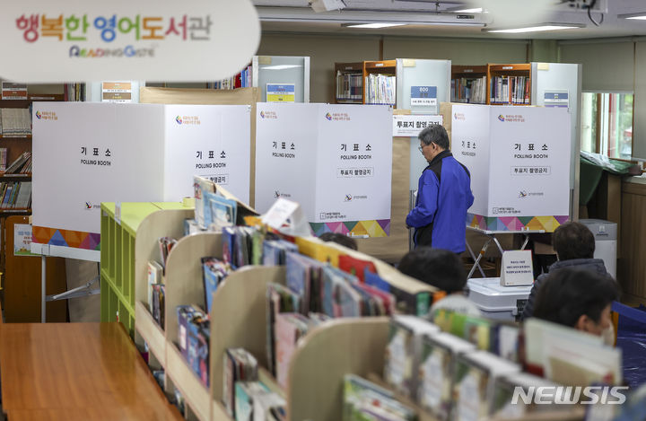 [서울=뉴시스] 정병혁 기자 = 제22대 국회의원 선거일인 10일 서울 종로구 상명대학교사범대학부속초등학교 도서관에 마련된 투표소를 찾은 유권자들이 투표를 하고 있다. 2024.04.10. [email protected]