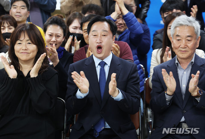 [수원=뉴시스] 경기사진공동취재단 = 제22대 국회의원선거 수원 정에 출마한 더불어민주당 김준혁 후보가 10일 오후 경기도 수원시 영통구 선거사무소에서 출구조사 결과를 보며 기뻐하고 있다. 2024.04.10. [email protected]