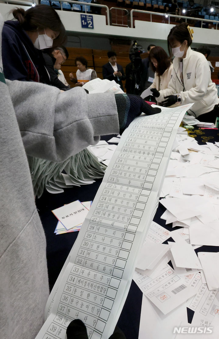 [서울=뉴시스] 김진아 기자 = 10일 오후 서울 관악구 서울대학교 종합체육관에 마련된 제22대 국회의원 선거 개표소에서 관계자들이 개표작업을 하고 있다. 2024.04.10. [email protected]