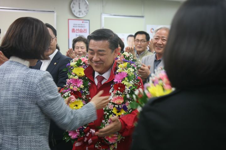 [부산=뉴시스] 당선이 확실시된 국민의힘 부산 금정구 백종헌 후보가 10일 밤 선거사무실에서 지지자들과 인사를 나누고 있다. (사진=백종헌 후보 캠프 제공) 2024.04.11. [email protected]