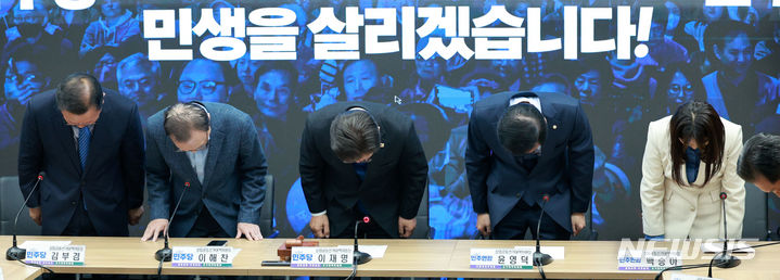 [서울=뉴시스] 고범준 기자 = 이재명 더불어민주당 대표가 11일 오전 서울 영등포구 더불어민주당 중앙당사에서 열린 더불어민주당·더불어민주연합 제12차 합동 중앙선거대책위원회의 겸 선대위 해단식에서 고개숙여 인사하고 있다. 왼쪽부터 김부겸-이해찬 더불어민주당 상임공동선대위원장, 이 대표, 윤영덕-백승아 더불어민주연합 상임공동선대위원장. 2024.04.11. [email protected]
