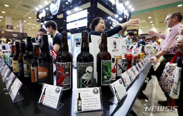 [서울=뉴시스] 김진아 기자 = 11일 오전 서울 강남구 코엑스에서 열린 대한민국맥주박람회·드링크서울에서 관람객들이 맥주를 시음하고 있다. 2024.04.11. [email protected]