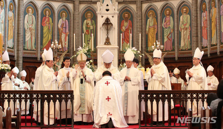 [서울=뉴시스] 사진공동취재단 = 이경상 신임 보좌주교가 11일 서울 명동대성당에서 거행된 주교 서품식에서 주교들에게 안수를 받고 있다. 2024.04.11. [email protected]