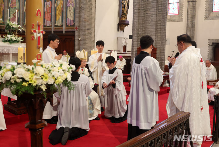 [서울=뉴시스] 사진공동취재단 = 이경상 신임 보좌주교 주교 서품식이 11일 서울 명동대성당에서 거행되고 있다. 2024.04.11. [email protected]