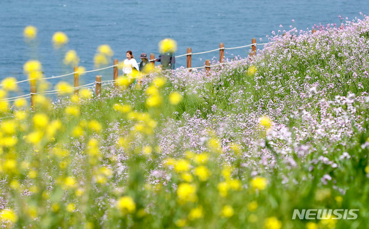 [제주=뉴시스] 우장호 기자 = 맑은 날씨를 보이는 12일 오후 제주시 조천읍 함덕리 서우봉 둘레길에 갯무꽃과 유채꽃이 피어나 지나는 이들의 시선을 사로잡고 있다. 2024.04.12. [email protected]
