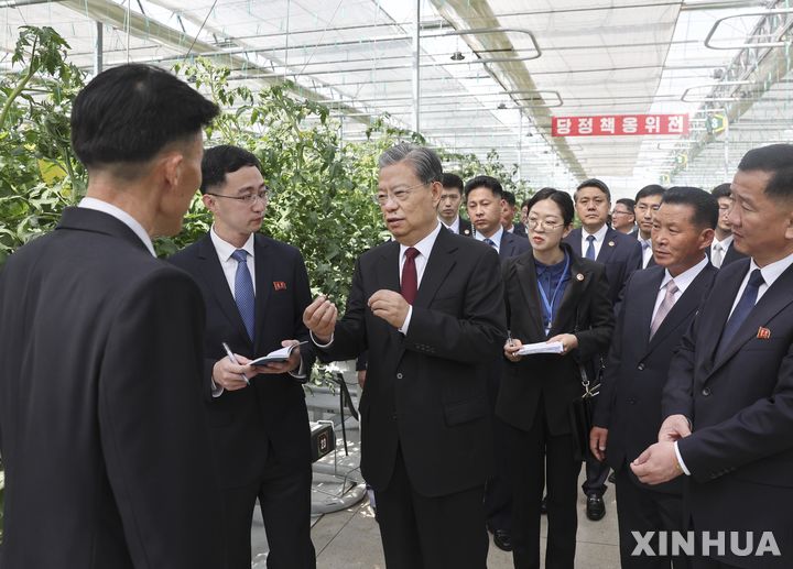 [평양=신화/뉴시스] 북한을 방문 중인 자오러지(가운데) 중국 전국인민대표대회 상무위원장이 12일 북한 평양의 강동종합온실농장을 방문해 관계자들과 얘기하고 있다. 자오러지 위원장은 최룡해 북한 최고인민회의 상임위원장과 회담 후 '중-북 친선의 해' 개막식에도 함께 참석했다. 2024.04.13.