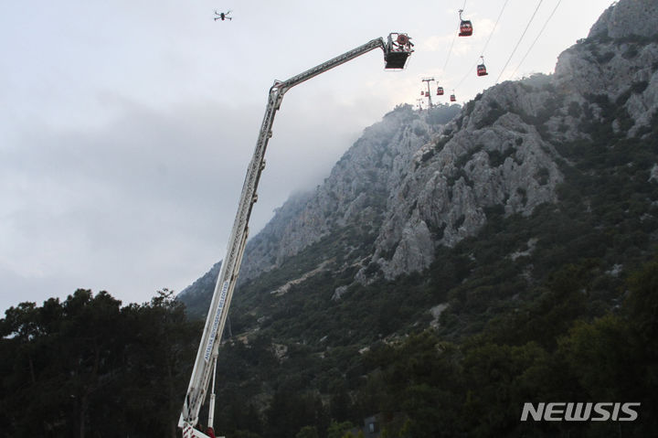 [안탈리아=AP/뉴시스] 12일(현지시각) 튀르키예 남부 안탈리아 외곽 케이블카 사고 현장에서 구조대가 구조 작업하고 있다. 현지 경찰은 이곳 휴양지에서 케이블카 한 대가 철탑과 충돌해 승객들이 추락, 1명이 숨지고 어린이 포함 7명이 다쳤다고 전했다. 이 사고로 케이블카 운행이 중단돼 승객 180여 명이 공중에 매달려 있었던 것으로 알려졌다. 2024.04.13.