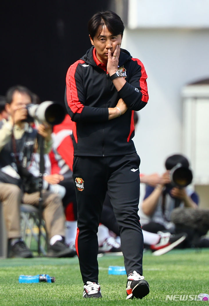 [서울=뉴시스] 황준선 기자 = 13일 서울 마포구 서울월드컵경기장에서 열린 프로축구 하나원큐 2024 K리그1 FC서울과 포항 스틸러스의 경기, 서울 김기동 감독이 경기를 지켜보고 있다. 2024.04.13. [email protected]