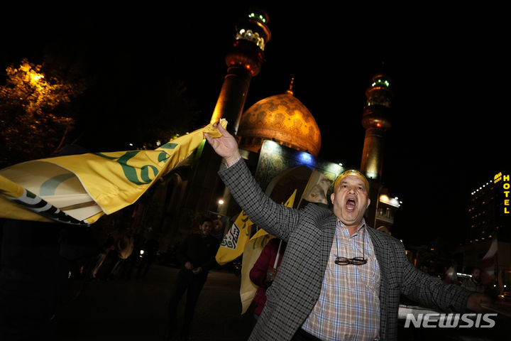[테헤란=AP/뉴시스] 14일(현지시각) 이란 테헤란의 팔레스타인 광장에서 반이스라엘 집회가 열려 한 남성이 구호를 외치고 있다. 이란이 이스라엘의 시리아 주재 이란 영사관 공습에 대한 보복으로 이스라엘을 겨냥해 100여 대의 무인기와 미사일 등을 발사한 것으로 알려졌다. 2024.04.14.