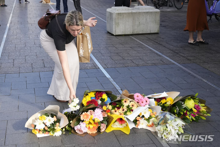 [시드니=AP/뉴시스] 14일(현지시각) 호주 시드니의 본다이 정션에 마련된 임시 추모소에 한 여성이 꽃다발을 놓고 있다. 현지 경찰은 전날 본다이 정션의 웨스트필드 쇼핑센터에서 흉기 난동이 발생해 최소 7명이 숨지고 8명이 다쳤으며 조엘 카우치(40)라는 용의자를 사살했다고 밝혔다. 2024.04.14.