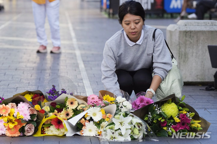 [시드니=AP/뉴시스] 14일(현지시각) 호주 시드니의 본다이 정션에 마련된 임시 추모소에 한 여성이 꽃다발을 놓고 있다. 현지 경찰은 전날 본다이 정션의 웨스트필드 쇼핑센터에서 흉기 난동이 발생해 최소 7명이 숨지고 8명이 다쳤으며 조엘 카우치(40)라는 용의자를 사살했다고 밝혔다. 2024.04.14.