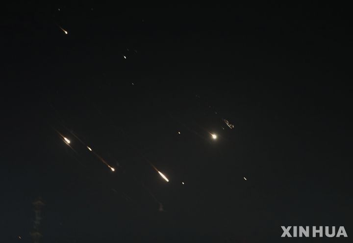 [예루살렘=신화/뉴시스]예루살렘 상공에서 14일 새벽 이스라엘에 대한 이란의 드론 및 미사일 공격을 요격하기 위해 발사된 이스라엘 아이언돔 미사일 방어시스템에 의한 불꽃들이 목격되고 있다. 2024.04.14.