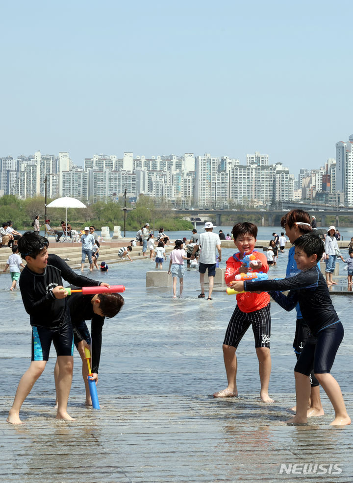 [서울=뉴시스] 조성봉 기자= 때 이른 더위가 찾아온 14일 오후 서울 여의도 한강공원 물빛광장에서 어린이들이 물총싸움을 하며 더위를 식히고 있다. 2024.04.14. [email protected]