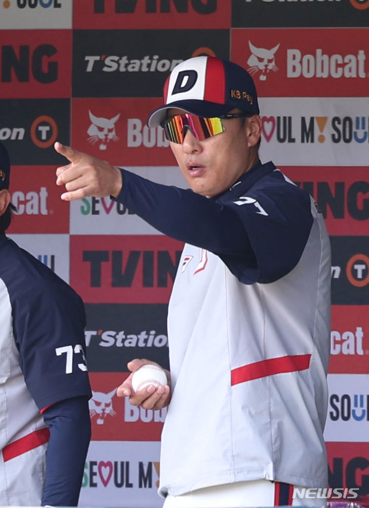 [서울=뉴시스] 권창회 기자 = 14일 오후 서울 송파구 잠실야구장에서 열린 2024 KBO리그 LG트윈스 대 두산베어스의 경기, 2회말 두산 이승엽 감독이 경기를 지켜보고 있다. 2024.04.14. [email protected]