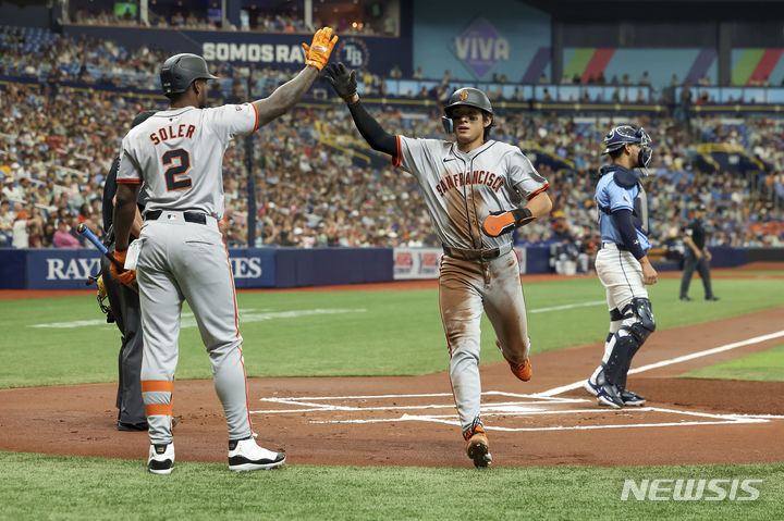 [세인트피터즈버그=AP/뉴시스] 샌프란시스코 자이언츠의 이정후가 14(현지시각) 미 플로리다주 세인트피터즈버그의 트로피카나 필드에서 열린 2024 미프로야구(MLB) 탬파베이 레이스와 경기 1회 초 우전 안타로 진루 후 도루와 후속 적시타로 득점하고 있다. 이정후는 5타수 1안타 1득점 1도루를 기록했고 팀은 4-9로 패했다. 2024.04.15.