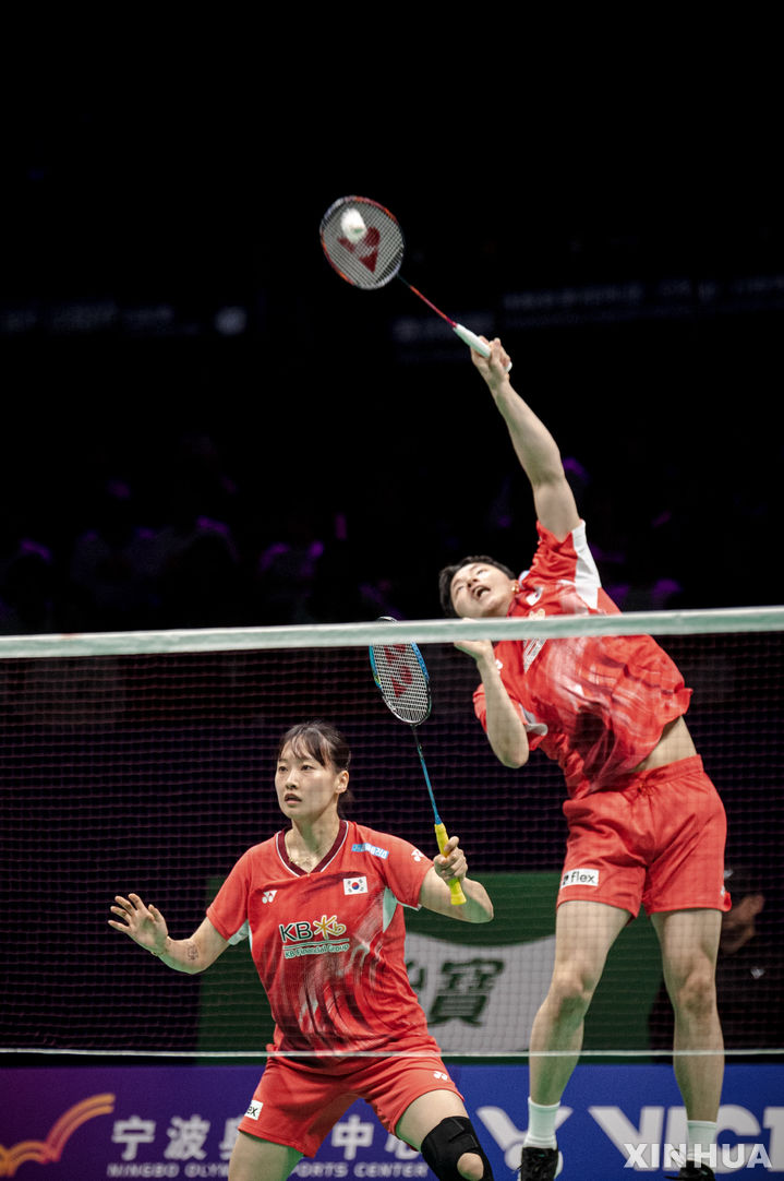 [닝보=신화/뉴시스] 서승재-채유정 조(4위)가 14일(현지시각) 중국 저장성 닝보 올림픽스포츠 센터에서 열린 2024 아시아개인배드민턴선수권대회 혼합복식 결승에서 펑옌저-황둥핑 조(3위·중국)와 경기하고 있다. 서승재-채유정은 1-2(21-13 15-21 14-21)로 역전패 당하며 2위를 기록했다. 2024.04.15.
