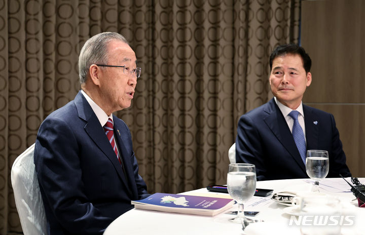 [서울=뉴시스] 김금보 기자 = 김영호(오른쪽) 통일부 장관과 반기문 전 유엔사무총장이 15일 서울 중구 롯데호텔서울에서 열린 외교 안보 원로 초청 오찬 간담회에서 환담을 나누고 있다. 2024.04.15. [email protected]