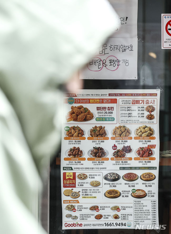 [서울=뉴시스] 정병혁 기자 = 15일 서울시내 한 굽네치킨 매장에 메뉴표가 붙어 있다. 식품·외식업계가 그동안 가격인상을 자제해 왔지만, 4·10 총선이 지나면서 제품 가격 인상 움직임이 본격적으로 확산할 조짐을 보이고 있다. 15일 굽네는 가맹점 수익 악화를 개선하기 위해 치킨 메뉴 9개 가격을 1900원씩 인상한다. 2022년 이후 2년 만이다. 대표메뉴인 오리지날은 기존 1만6000원에서 1만7900원으로, 고추바사삭은 1만8000원에서 1만9900원으로 오른다. 2024.04.15. [email protected]