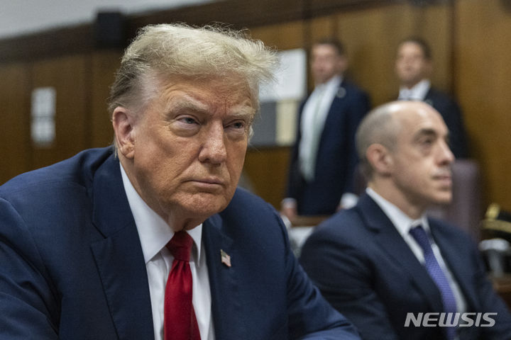 [뉴욕=AP/뉴시스] 미 공화당 대선 후보인 도널드 트럼프 전 대통령이 15일(현지시각) 뉴욕의 맨해튼 형사법원에 출석해 피고인석에 앉아 있다. 트럼프 전 대통령은 법원 출석 전 "전에 없던 정치적 박해"라고 주장하며 "이것은 곧 미국에 대한 공격"이라고 말했다. 그는 2016년 10월 대선을 앞두고 성인영화 배우 스토미 대니얼스와 성 추문을 덮기 위해 개인 변호사였던 마이클 코언을 통해 13만 달러(약 1억7500만 원)를 건네고 회사 장부에 허위로 기재하는 등 34개 혐의를 받고 있다. 2024.04.16.