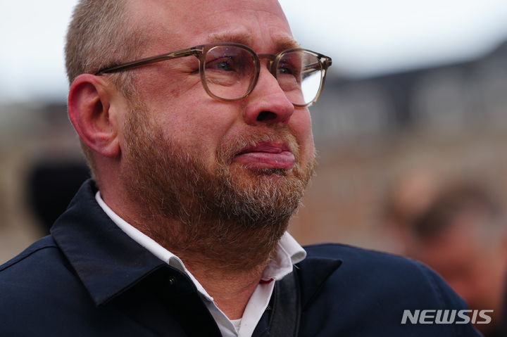 [코펜하겐=AP/뉴시스] 16일(현지시각) 덴마크 코펜하겐에 있는, 약 400년 된 구 증권거래소(보르센) 건물에서 화재가 발생해 이를 지켜보는 한 시민이 울먹이고 있다. 덴마크 최고(最古) 건물 중 하나인 이 건물 화재로 상징적인 첨탑이 무너졌으며 건물 내에 있던 사람은 모두 대피한 것으로 알려졌다. 2024.04.16.