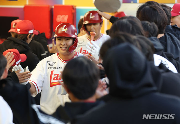 [인천=뉴시스] 고승민 기자 = 16일 인천랜더스필드에서 열린 2024 KBO 리그 KIA 타이거즈 대 SSG 랜더스 경기, 2회말 SSG 공격 1사 3루 상황 7번타자 고명준이 2점 홈런을 치고 덕아웃서 기뻐하고 있다. 2024.04.16. [email protected]