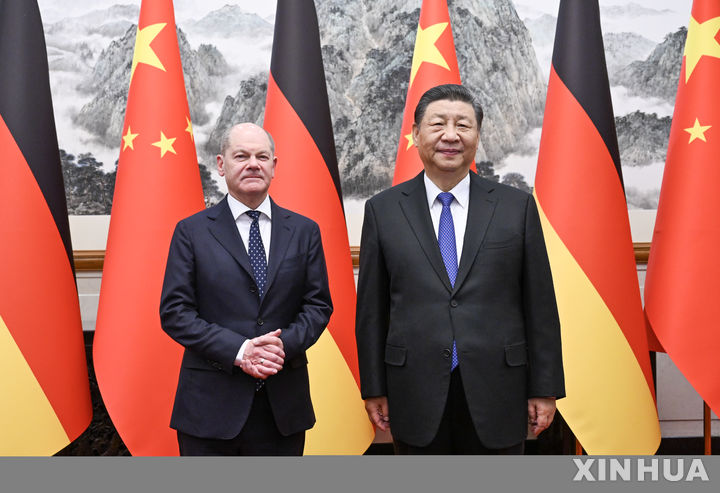 [베이징=신화/뉴시스] 올라프 숄츠(왼쪽) 독일 총리가 16일 중국 베이징의 댜오위타이 국빈관에서 시진핑 국가주석과 회담 전 기념 촬영을 하고 있다. 숄츠 총리는 시진핑 주석에게 러시아의 우크라이나 침공이 세계 안보를 위협하고 있으며 러시아가 우크라이나 전쟁에서 핵무기 사용을 위협해서는 안 된다고 강조했다고 독일 언론이 전했다. 2024.04.17.
