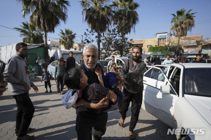 [가자지구=AP/뉴시스] 16일(현지시각) 가자지구 중부 마가지 난민촌 주민들이 이스라엘의 폭격으로 다친 가족을 안고 병원으로 달리고 있다. 이스라엘군이 가자지구 중부 마가지 난민촌을 공습해 팔레스타인 주민 여러 명이 숨진 것으로 알려졌다. 2024.04.17.
