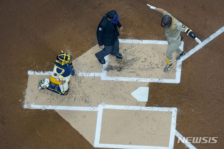 [샌디에이고=AP/뉴시스] 샌디에이고 파드리스의 김하성이 16일(현지시각) 미 위스콘신주 밀워키의 아메리칸 패밀리 필드에서 열린 2024 미프로야구(MLB) 밀워키 브루어스와 경기 1회 초 3점 홈런을 친 후 홈에 들어오고 있다. 2024.04.17.