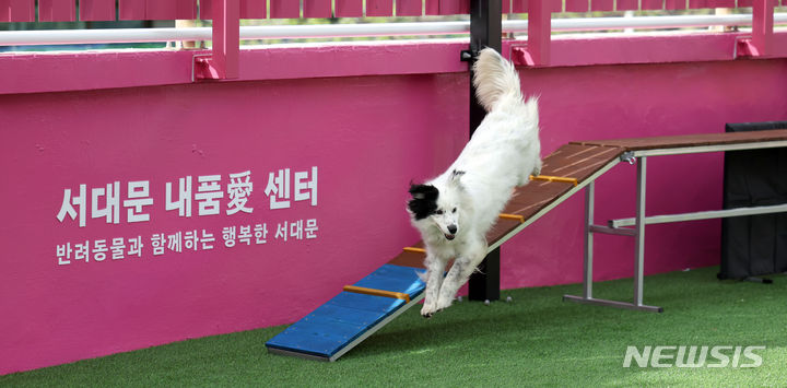 [서울=뉴시스] 김선웅 기자 = 17일 서울 서대문구 소재 서대문 내품애(愛)센터에서 어질리티 공연이 펼쳐지고 있다. 서대문 내품애(愛)센터는 성숙한 반려동물 양육 문화를 확산하기 위해 서대문구가 개소한 센터로서 유기견 보호실, 상담실, 놀이실, 목욕·미용실, 체험교육장, 실외놀이터 등으로 구성돼있다. 또한 유기동물 보호·입양 상담, 동물 문화교실, 동물 매개 치유 등 다양한 프로그램이 진행된다. 2024.04.17. [email protected]