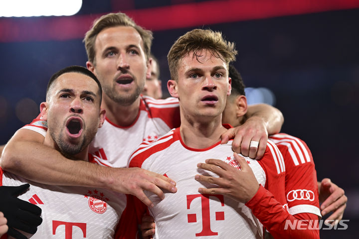 [뮌헨=AP/뉴시스] 바이에른 뮌헨(독일)의 조슈아 키미히(오른쪽)가 17일(현지시각) 독일 뮌헨의 알리안츠 아레나에서 열린 아스널(잉글랜드)과의 2023-24 유럽축구연맹(UEFA) 챔피언스리그(UCL) 8강 2차전 후반 18분 선제 결승 골을 넣고 동료들과 기쁨을 나누고 있다. 김민재는 후반 31분 교체 출전했고 뮌헨은 1-0으로 승리해 1차전과 합계 3-2로 UCL 4강에 올랐다. 2024.04.18.