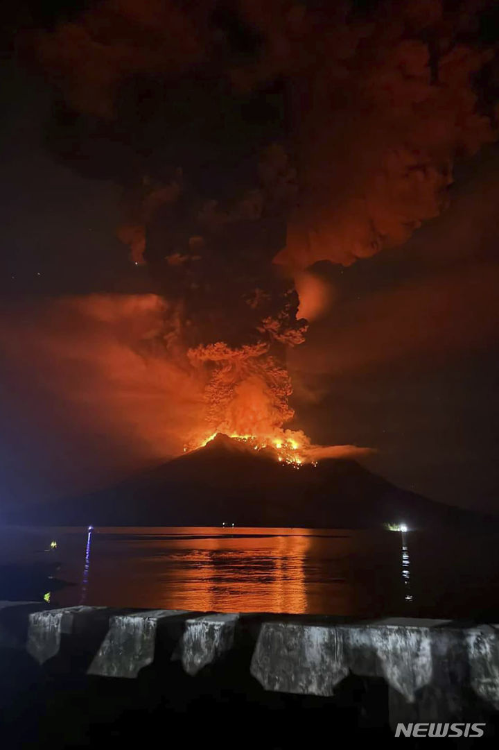 [루앙섬=AP/뉴시스] 17일(현지시각) 인도네시아 북술라웨시주 루앙섬의 루앙 화산이 분화해 뜨거운 용암과 화산재가 분출되고 있다. 인도네시아 당국은 루앙 화산 폭발로 화산재가 1800m까지 치솟고 용암이 흘러내리자, 화산 경보를 최고 수준으로 상향하고 인근 주민 1만1천여 명에게 대피령을 내렸다. 2024.04.18.