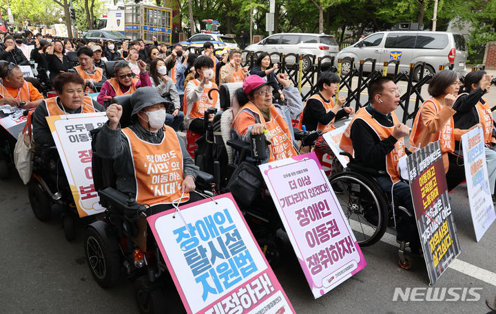 [서울=뉴시스] 김명원 기자 = 전장연회원들이 18일 오전 서울 영등포구 63컨벤션센터 앞에서 열린 장애인 차별 철폐의날 기념식을 하고 있다. 2024.04.18. [email protected]