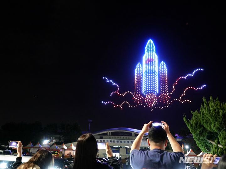 [제주=뉴시스] 오영재 기자 = 19일 오후 제주 서귀포시 강창학종합경기장에서 열린 제58회 제주도민체육대회 개막식에서 제1회 드론라이트쇼가 열리고 있다. 2024.04.19. [email protected]