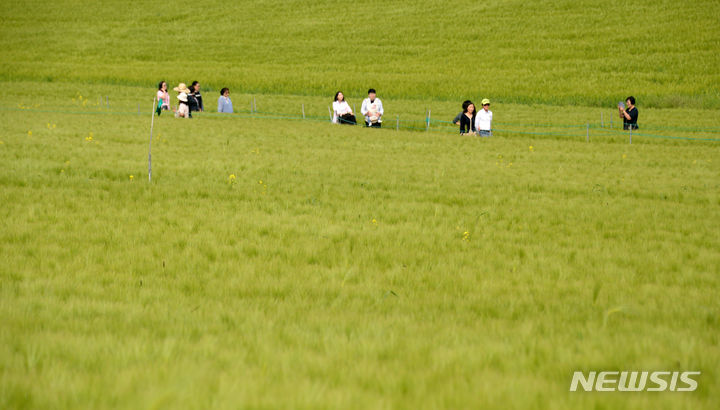[고창=뉴시스] 김얼 기자 = 고창청보리밭 축제 개막을 하루 앞둔 19일 전북 고창군 고창청보리밭 축제장을 찾은 시민들이 청보리밭 사이를 지나며 산책을 즐기고 있다. 2024.04.19. [email protected]