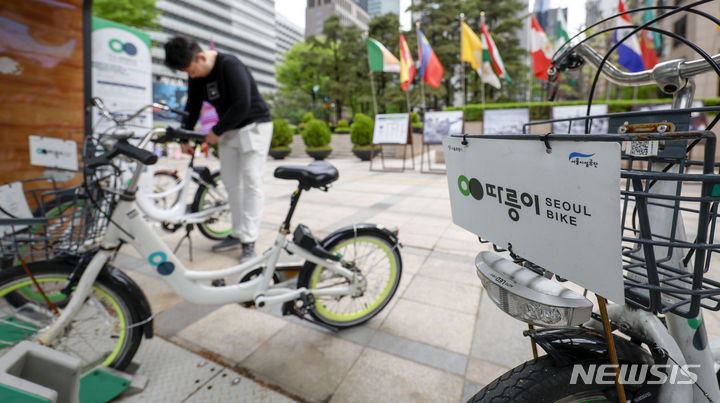 [서울=뉴시스] 정병혁 기자 = 21일 서울시내 따릉이 대여소에서 한 시민이 서울자전거 '따릉이'를 이용하고 있다. 서울시가 오는 22일 자전거의 날을 앞두고 사흘간 공공자전거 '따릉이' 무료 이용권을 지급한다. 20일부터 22일까지 따릉이 앱에 회원가입한 뒤 퀴즈 이벤트에 참여하면 따릉이 무료 이용권을 받을 수 있다. 하루 1회씩 최장 3일간 참여해 이용권을 받을 수 있고, 신규 가입자도 참여할 수 있다. 2024.04.21. [email protected]