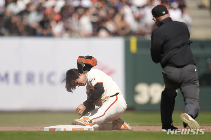 [샌프란시스코=AP/뉴시스] 샌프란시스코 자이언츠의 이정후가 21일(현지시각) 미 캘리포니아주 샌프란시스코의 오라클 파크에서 열린 2024 미프로야구(MLB) 애리조나 다이아몬드백스와의 경기 8회 말 볼넷 이후 2루 도루를 시도하다가 아웃되고 있다. 이정후는 2타수 무안타 1볼넷 1사구를 기록했고 팀은 3-5로 패했다. 2024.04.22.