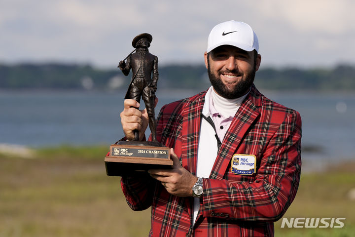 [힐턴 헤드=AP/뉴시스] 스코티 셰플러(미국)가 22일(현지시각) 미 사우스캐롤라이나주 힐턴 헤드 아일랜드의 하버타운 골프 링크스에서 열린 미국프로골프(PGA) 투어 RBC 헤리티지 정상에 올라 트로피를 들고 포즈를 취하고 있다. 셰플러는 최종 합계 19언더파 265타로 우승하며 올해 출전한 5경기에서 4승을 기록했다. 2024.04.23.
