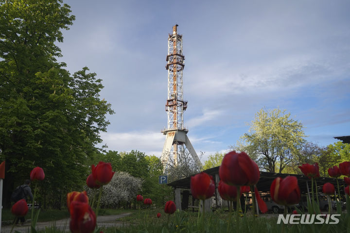 [하르키우=AP/뉴시스] 22일(현지시각) 우크라이나 하르키우에 있는 높이 240m의 TV 송신탑이 러시아의 미사일 공격으로 절반가량이 파손된 채 남아 있다. 2024.04.23.