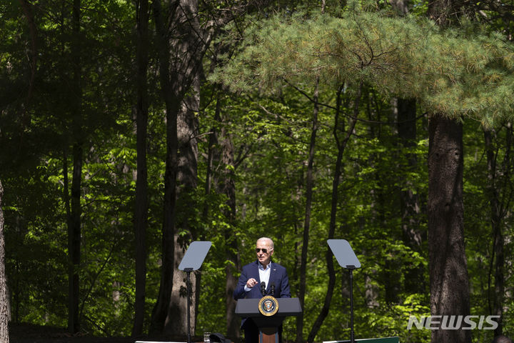 [트라이앵글=AP/뉴시스] 조 바이든 미국 대통령이 22일(현지시각) 지구의 날을 맞아 버지니아주 트라이앵글의 프린스 윌리엄 산림공원에서 연설하고 있다. 바이든 대통령은 "저소득층과 중산층의 에너지 비용을 줄이기 위한 '주거용 태양광 프로젝트'에 70억 달러의 연방 보조금을 지급할 것"이라고 밝혔다. 2024.04.23.