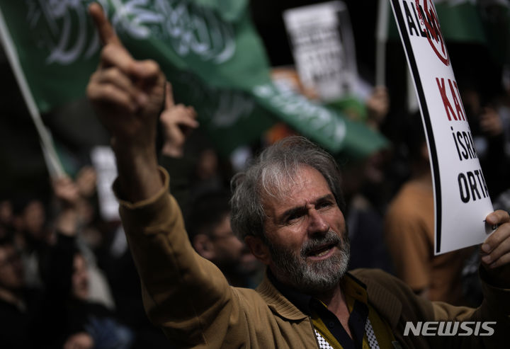 [이스탄불=AP/뉴시스] 프랑크 발터 슈타인마이어 독일 대통령의 튀르키예 공식 방문 이틀째인 23일(현지시각) 이스탄불에서 독일의 이스라엘 지지에 반대하는 시위대가 구호를 외치며 독일 영사관 앞을 지나가고 있다. 2024.04.24.