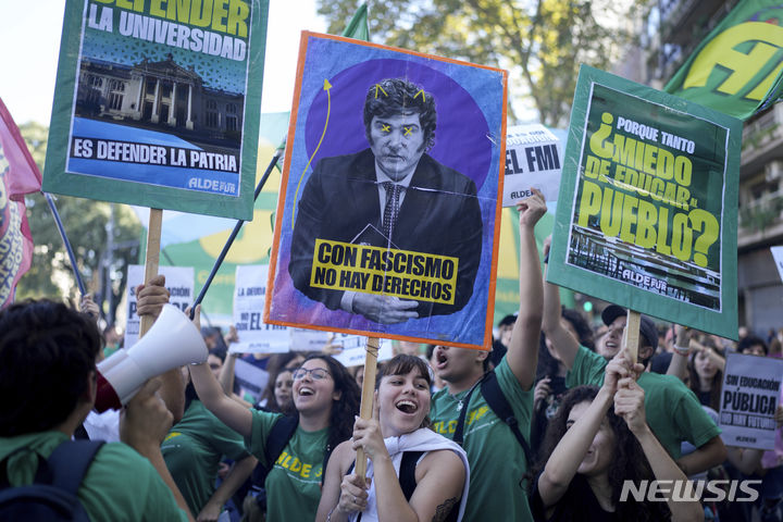 [부에노스아이레스=AP/뉴시스] 23일(현지시각) 아르헨티나 부에노스아이레스에서 각종 손팻말을 든 학생들이 공립대학에 더 많은 자금 지원을 요구하며 하비에르 밀레이 대통령의 긴축 정책에 반대하며 시위하고 있다. 학생들이 들고 있는 손팻말에는 "국민을 교육하는 데 뭐가 그리 두려운가", "대학을 지키는 것은 나라를 지키는 것" 등이 쓰여 있다. 2024.04.24.