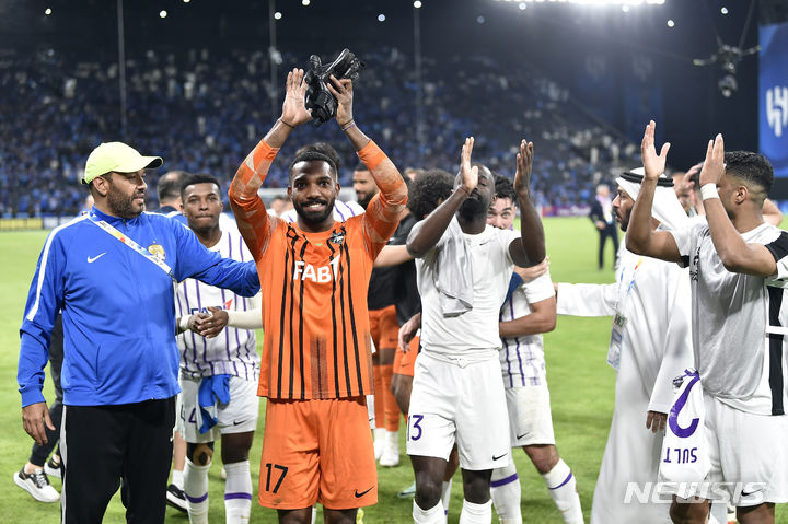 [리야드=AP/뉴시스] 알 아인(아랍에미리트) 선수들이 23일(현지시각) 사우디아라비아 리야드의 킹덤 아레나에서 열린 2023-24 아시아축구연맹(AFC) 챔피언스리그(ACL) 4강 2차전 알 힐랄(사우디)과의 경기를 마친 후 결승 진출에 기뻐하고 있다. 이날 박용우는 풀타임을 소화했고 알 아인은 1-2로 패했으나 1차전과 합계 5-4로 승리해 ACL 결승에 올랐다. 2024.04.24.
