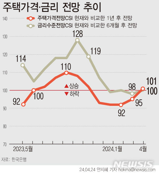 [서울=뉴시스] 24일 한국은행이 발표한 주택가격전망CSI는 101로 아파트매매가격 하락세 둔화, 거래량 소폭 회복 등으로 6포인트 올랐다. 지난해 11월 기록한 102 이후 처음으로 100을 상회한 것으로 지난해 6월 기록한 8포인트 이후 가장 큰 증가 폭이기도 하다. 금리수준전망CSI는 100으로 금리 인하 기대 약화에 2포인트 올랐다. (그래픽=안지혜 기자)