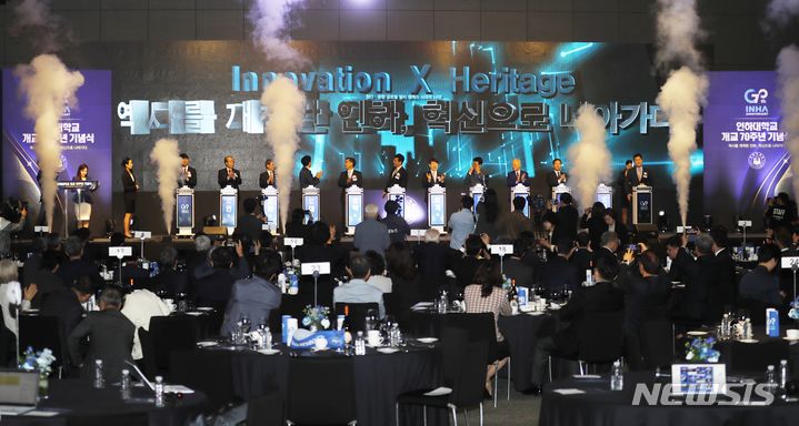 [인천=뉴시스] 김동영 기자 = 김진규(왼쪽부터) 인하대 총학생회 회장, 남종우 전 부총장, 김두한 인하대 총동창회 회장, 박찬대 국회의원, 류경표 한진칼 대표이사, 조명우 인하대 총장, 현정택 정석인하학원 이사장, 허종식 국회의원, 지용택 새얼문화재단 이사장, 박덕수 인천시 행정부시장, 차태근 인하대 교수회 의장, 송병호 인하대 노동조합 위원장이 24일 오전 인천 중구 그랜드 하얏트 인천웨스트타워 그랜드볼룸에서 열린 ‘인하대학교 개교 70주년 기념식’에서 ‘인하 4.0’을 선포하고 있다. 2024.04.24. [email protected]