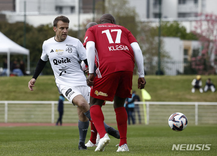 [플레지르=AP/뉴시스] 에마뉘엘 마크롱(왼쪽) 프랑스 대통령이 24일(현지시각) 프랑스 이블린주 플레지르의 베르나르 지루 경기장에서 열린 자선 축구 경기에 참여해 패스하고 있다. 이 경기에서 마크롱 대통령이 속한 팀이 5-2로 승리했다. 2024.04.25.