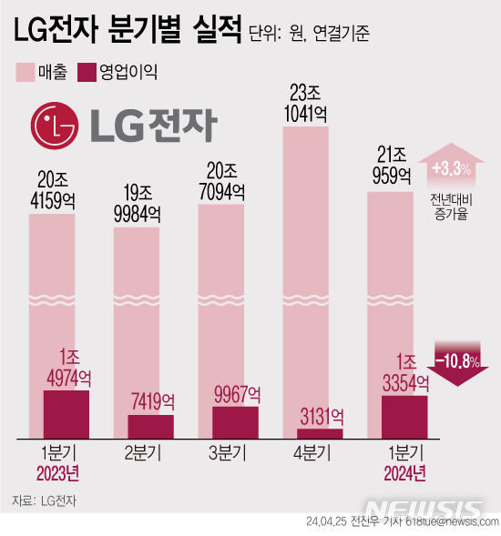 [서울=뉴시스] LG전자는 25일 올해 1분기(1~3월) 연결기준 매출액 21조959억원, 영업이익 1조3354억원을 확정 실적으로 발표했다. 매출액은 역대 1분기 중 최고치다. (그래픽=전진우 기자)