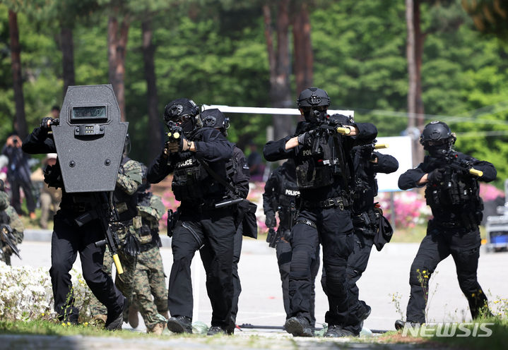 [서울=뉴시스] 김명년 기자 = 25일 오후 서울 광진구 구의아리수정수센터에서 열린 민·관·군·경·소방 전시 대비 '2024년 충무훈련' 국가중요시설 드론테러 대응훈련에서 경찰특공대 대원들과 제9공수특전여단 장병들이 적을 제압하기 위해 이동하고 있다. 2024.04.25. [email protected]