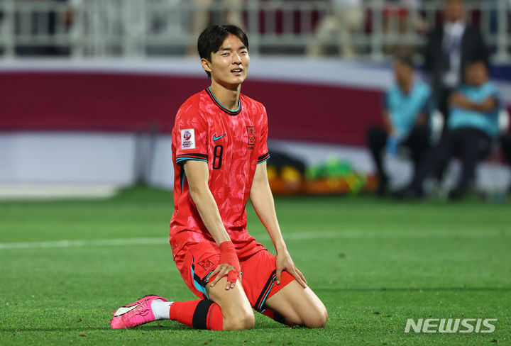 [도하(카타르)=뉴시스] 황준선 기자 = 25일(현지시간) 카타르 도하 압둘라 빈 칼리파 스타디움에서 열린 2024 아시아축구연맹(AFC) U-23 아시안컵 8강전 대한민국과 인도네시아의 경기, 승부차기에서 골을 넣지 못한 한국 이강희가 아쉬워하고 있다. 2024.04.25. [email protected]